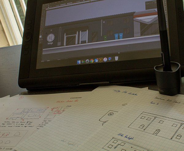 The next challenge was art direction, I want the animation to fit right in the district. At 1st I wanted to stick with the same illustration style throughout the mural but then it hit me, this is Raleigh’s Warehouse District and it represents so many creative perspectives that I had to show that. It’s more than just monochromatic murals on walls; it’s an area of collaboration. So I did my best to create different styles that works together transitioning throughout the animation and keeping key traits in mind such as tons of red with distressed fonts but keeping in mind this maybe projected on a red brick wall rather than white so limiting my use of reds.
